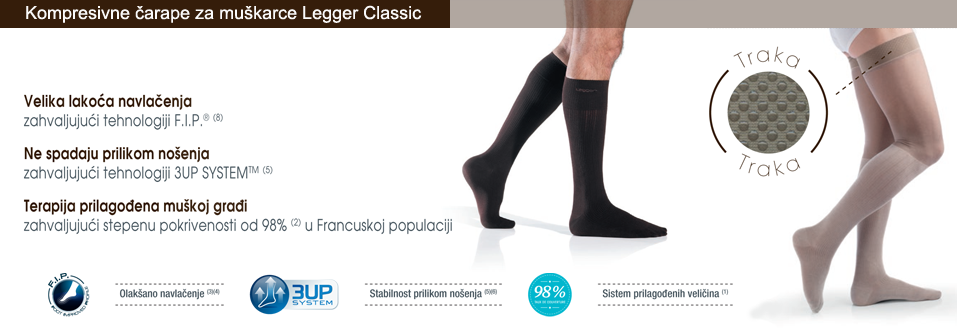 Vrlo elegante, prilagođena morfologiji muške noge. Legger je prefinjen, dostupan u klasi III, u tri boje: crna, pepeljasto siva i bež.